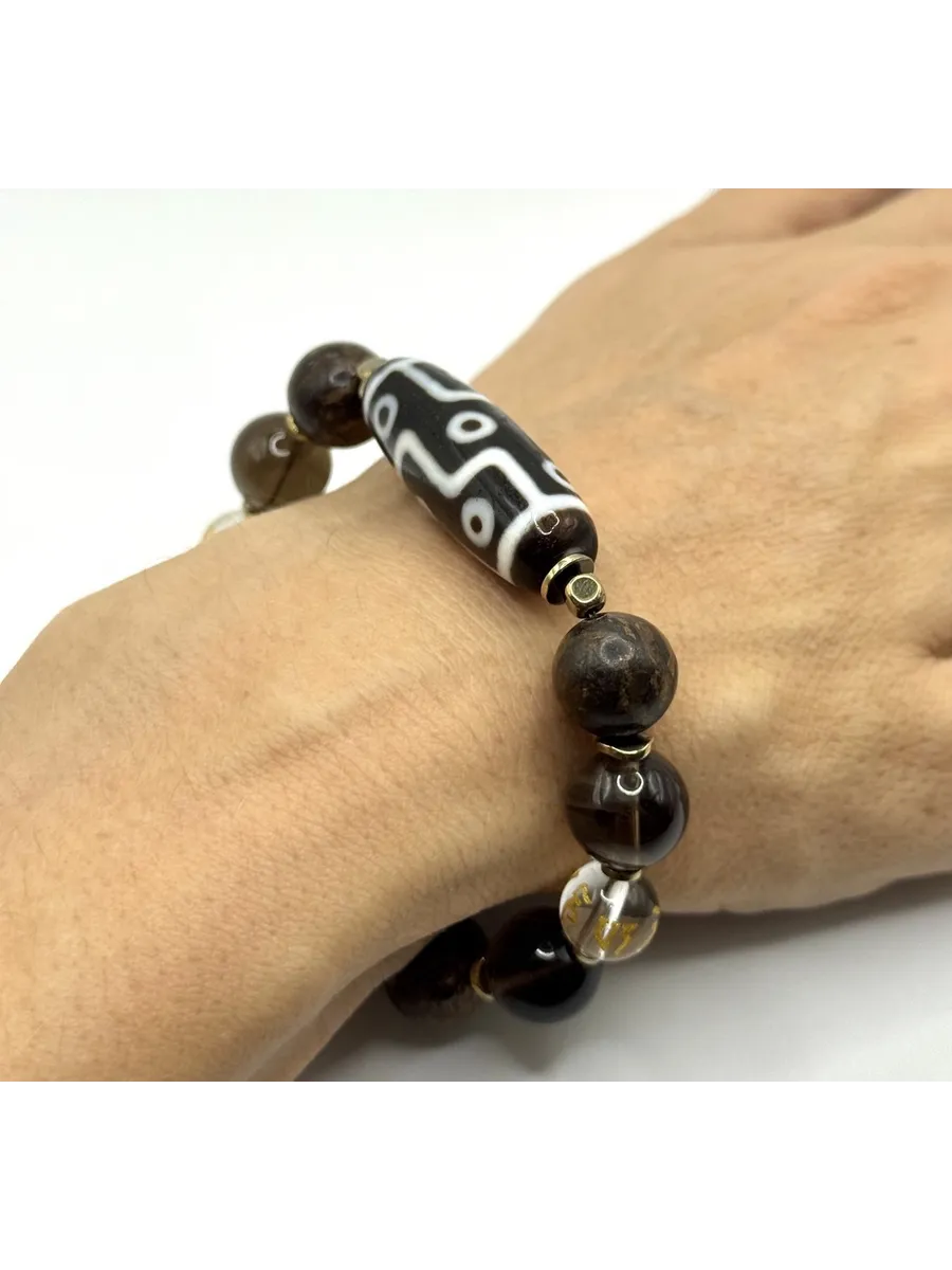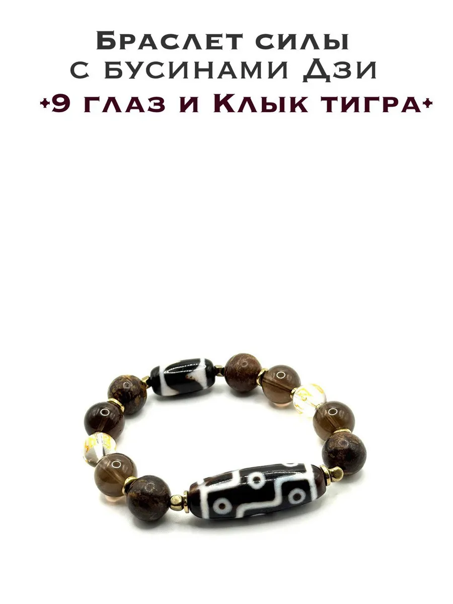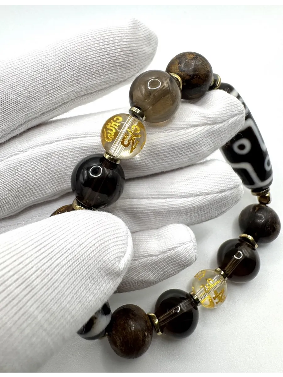 Две Дзи создают динамический баланс: девять глаз открывают возможности, клык тигра дает силу их реализовать. Бронзит и раухтопаз формируют несокрушимый внутренний стержень, а горный хрусталь с мантрой поддерживает чистоту намерений.