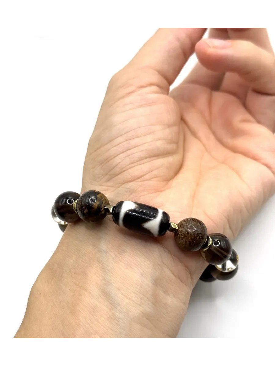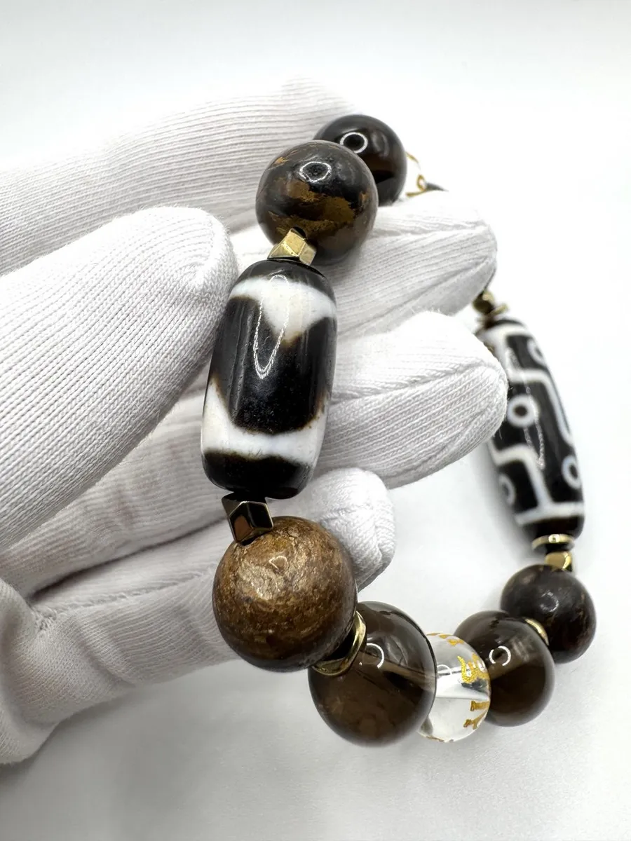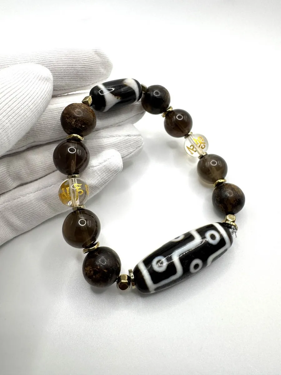Две Дзи создают динамический баланс: девять глаз открывают возможности, клык тигра дает силу их реализовать. Бронзит и раухтопаз формируют несокрушимый внутренний стержень, а горный хрусталь с мантрой поддерживает чистоту намерений.