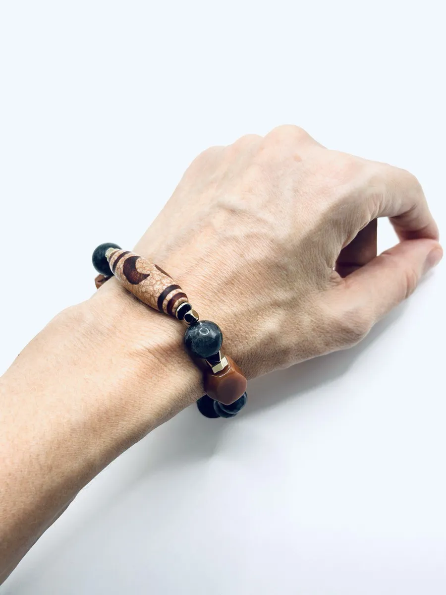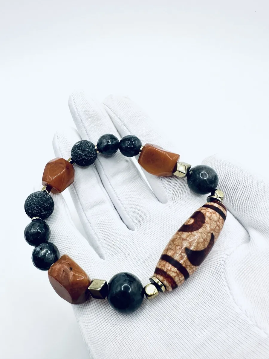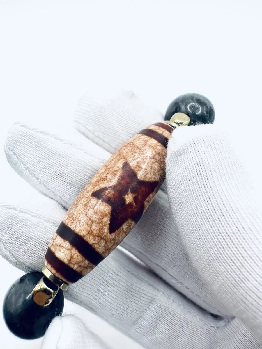 Центральная бусина этого браслета — настоящая тибетская Дзи возрастом 15-30 лет. Агатовая бусина с узором «Вселенная»: дарует своему владельцу более мощный поток универсальной вселенской энергии. Кроме того, Дзи Вселенная помогает получить знания о том, как использовать и применять эту энергию в жизни. Когда владелец этой бусины научится управлять могущественным потоком универсальной энергии, то он сможет наполнить жизненной энергией и гармонизировать как свою жизнь, так и помочь в этом другим людям.