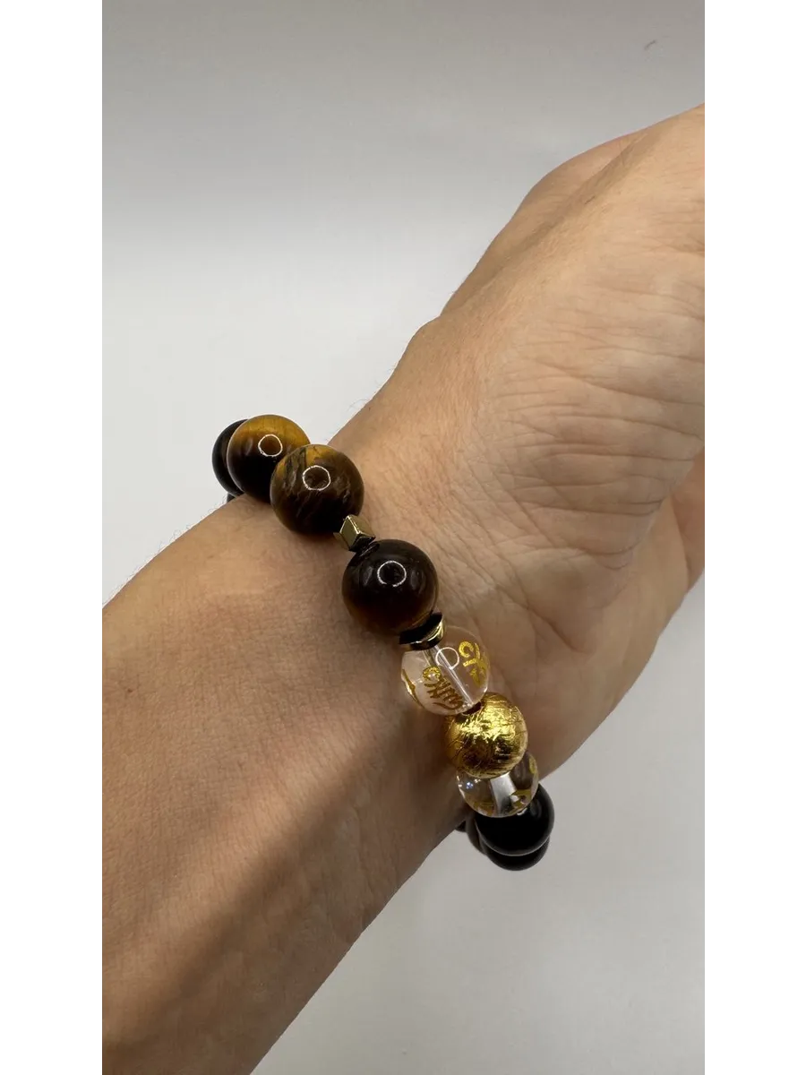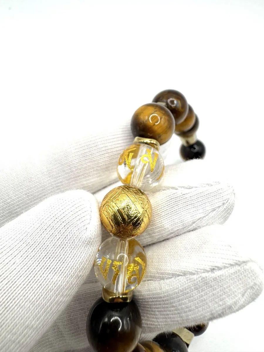 Тигровый глаз усиливает интуицию и защищает от энергетических атак. Хрустальные бусины с мантрой создают постоянное благословение — каждое движение руки активирует священные слоги.