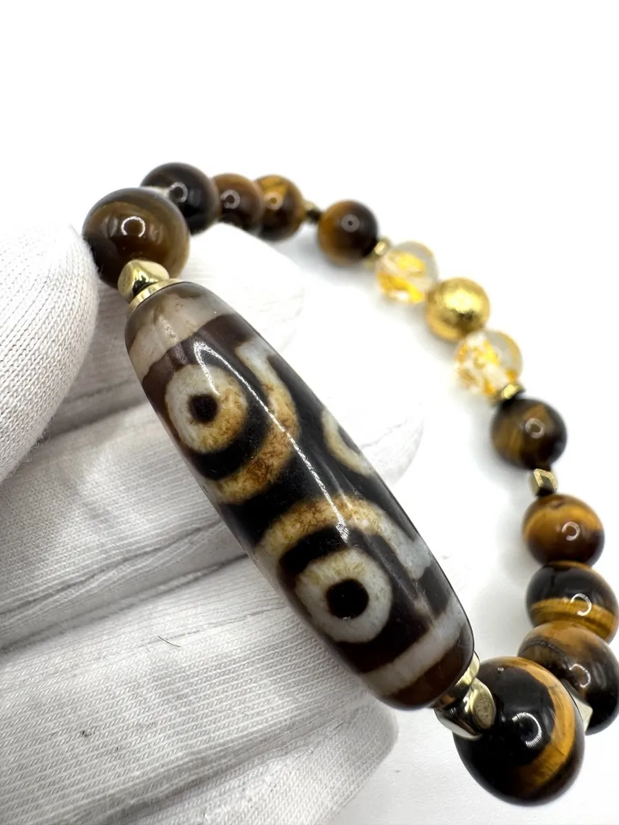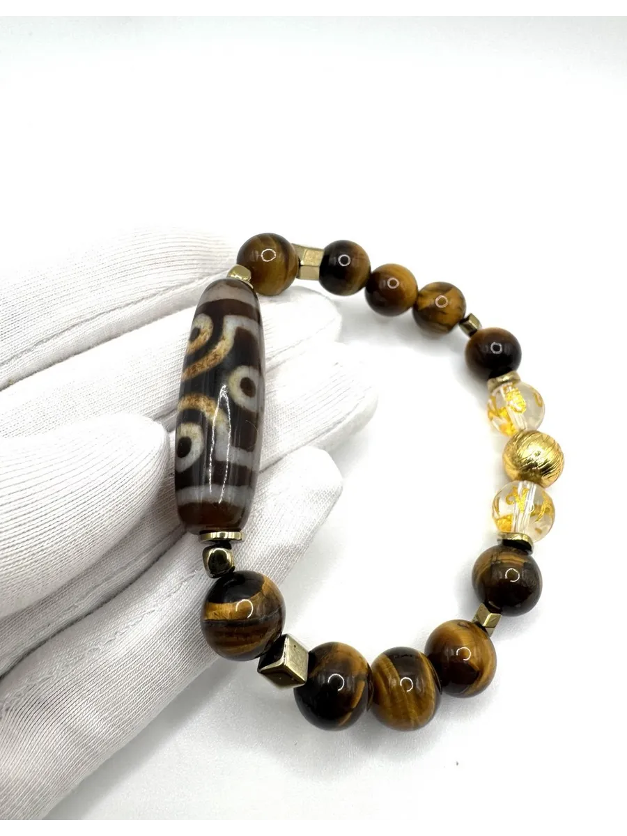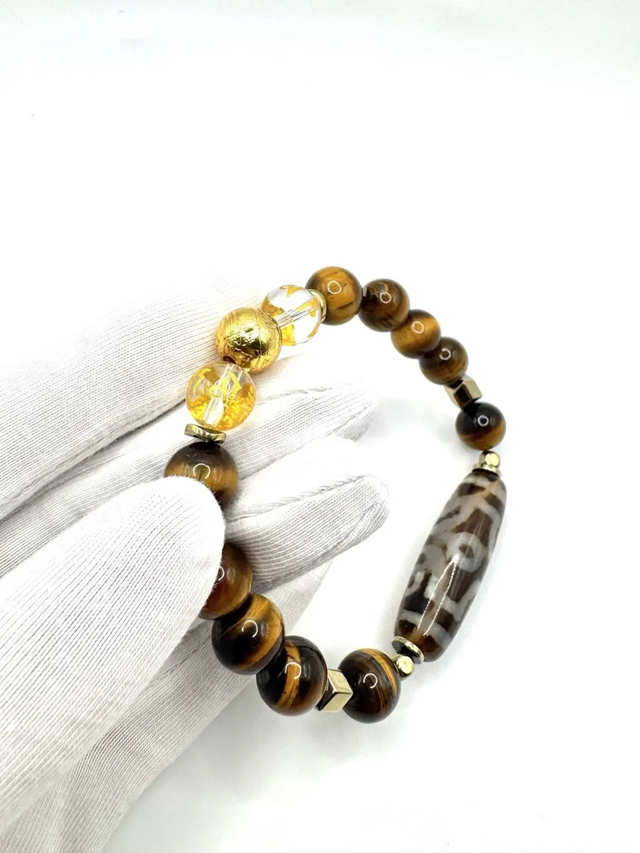Представьте браслет, в котором соединились осколок далёкой звезды и священная тибетская Дзи "Сердце Будды". Теплые коричневые и золотые тона создают гармоничную композицию силы и сострадания.