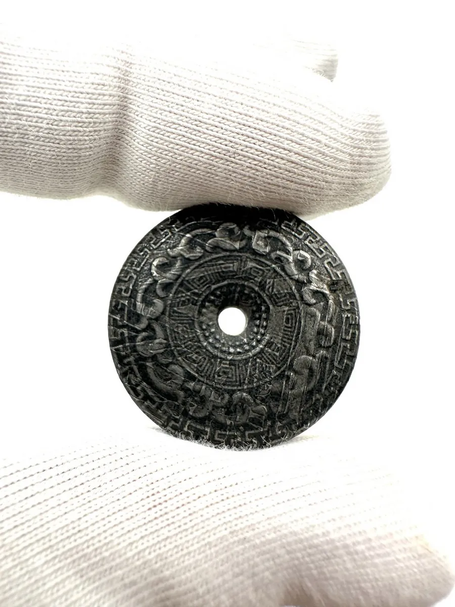 Поверхность покрыта концентрическими поясами орнаментов. Внешний круг — стилизованные драконы-хранители. Средний пояс — меандр, символ бесконечности и вечного возвращения. Внутренние кольца — геометрические узоры грома и облаков. Резьба нанесена с обеих сторон — диск работает в любом положении.