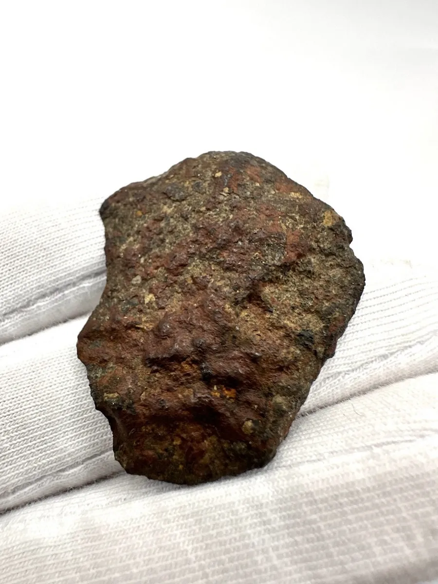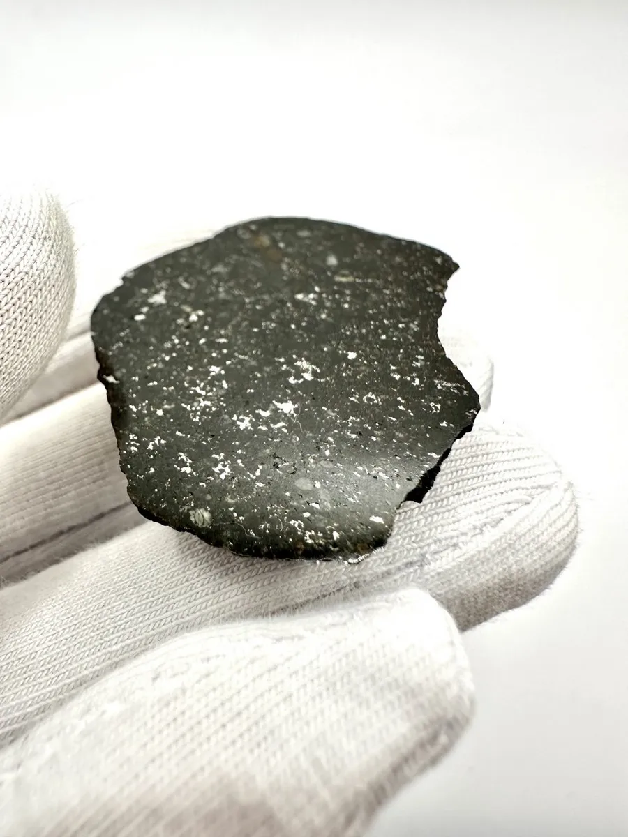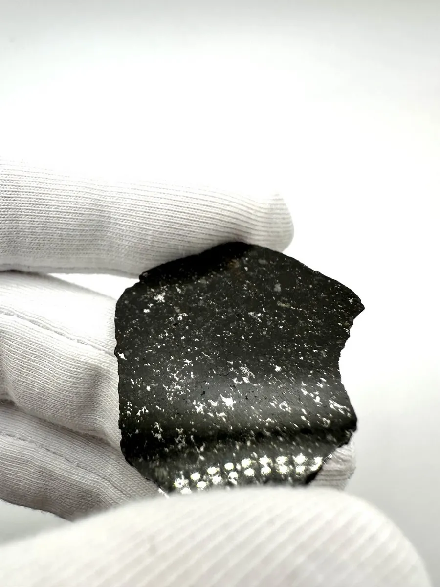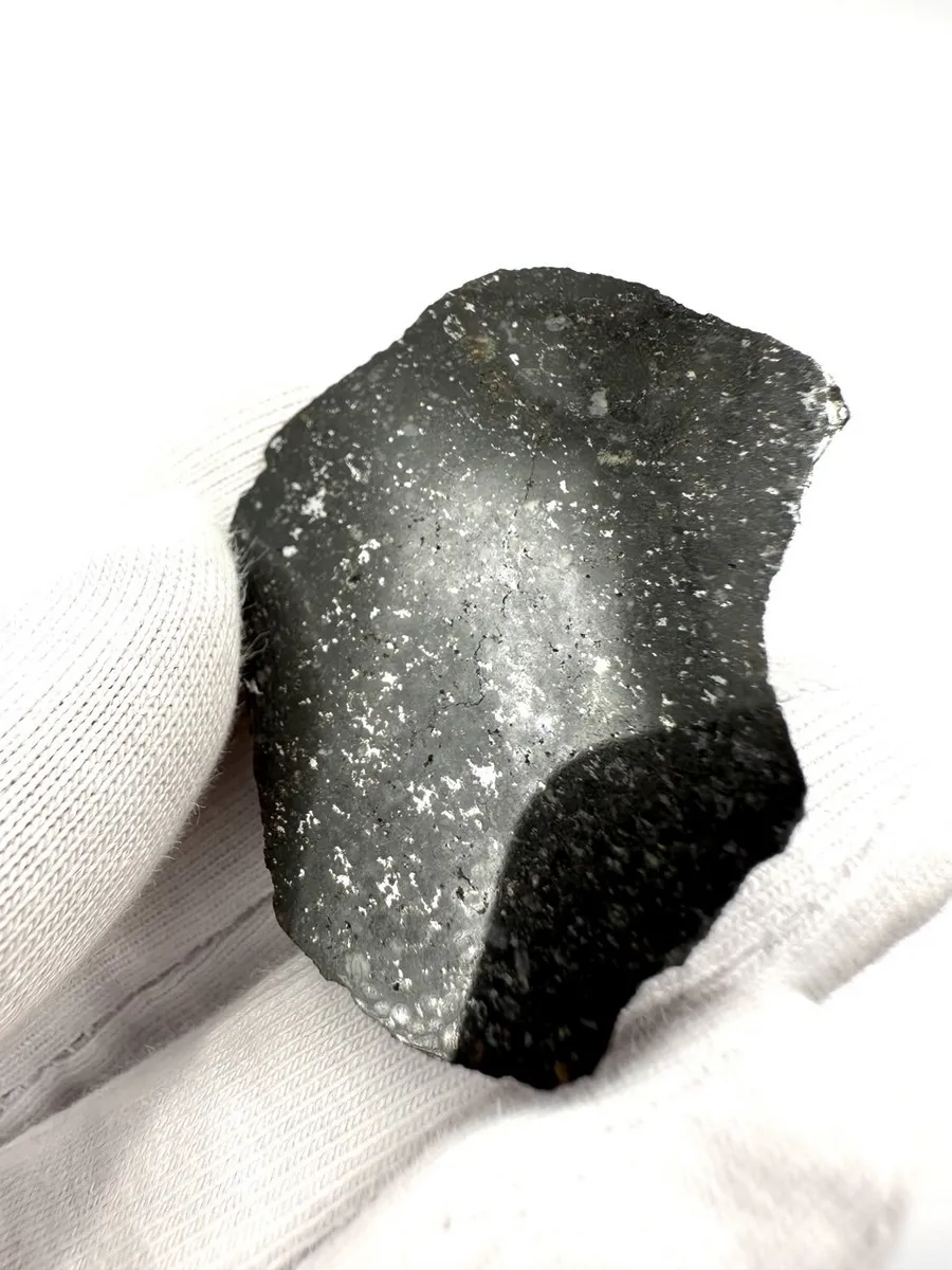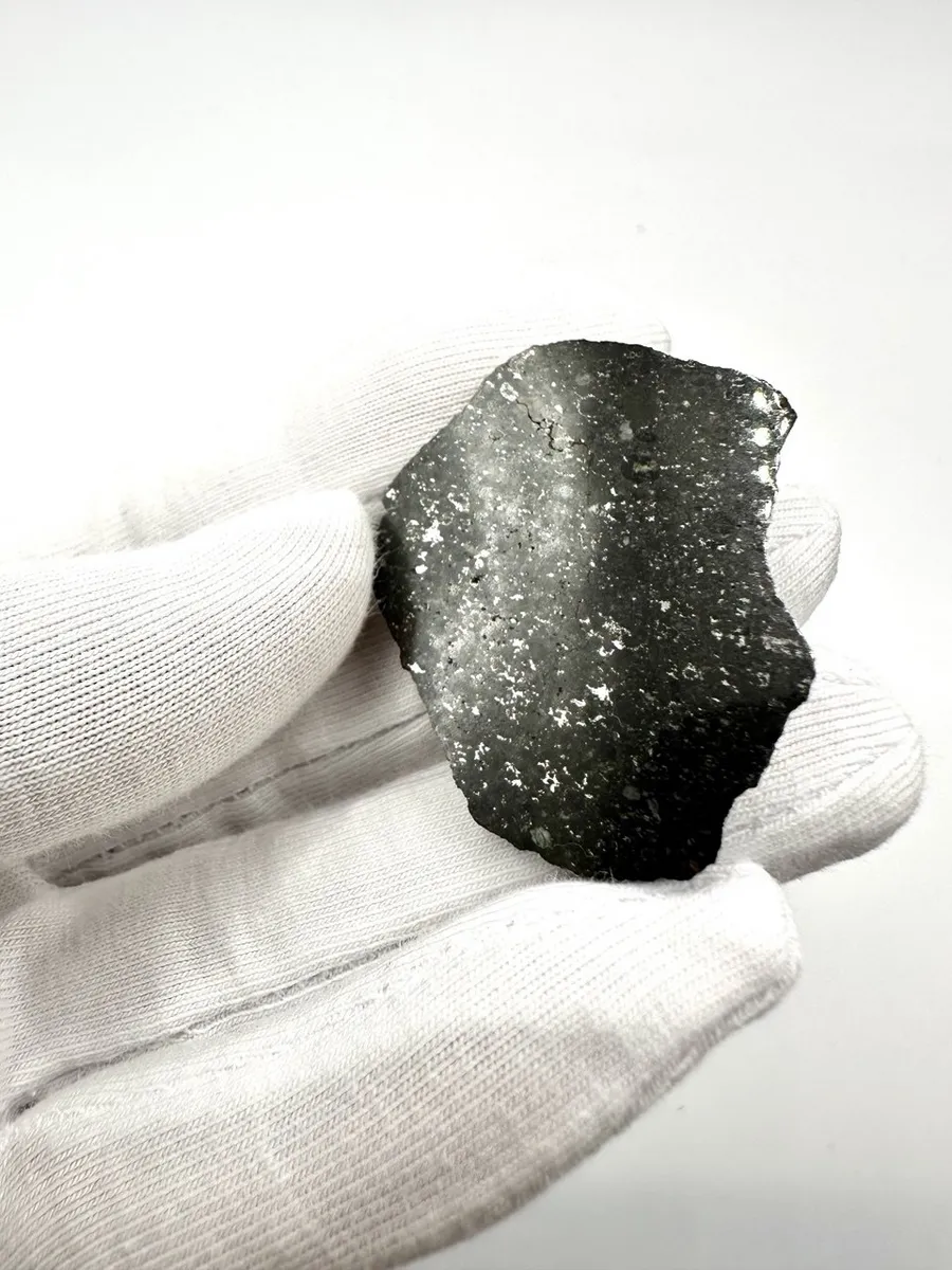 Кора плавления — аутентичная "горбушка" с характерными регмаглиптами (углублениями), образовавшимися при прохождении через земную атмосферу. Это подлинная космическая печать, удостоверяющая внеземное происхождение.