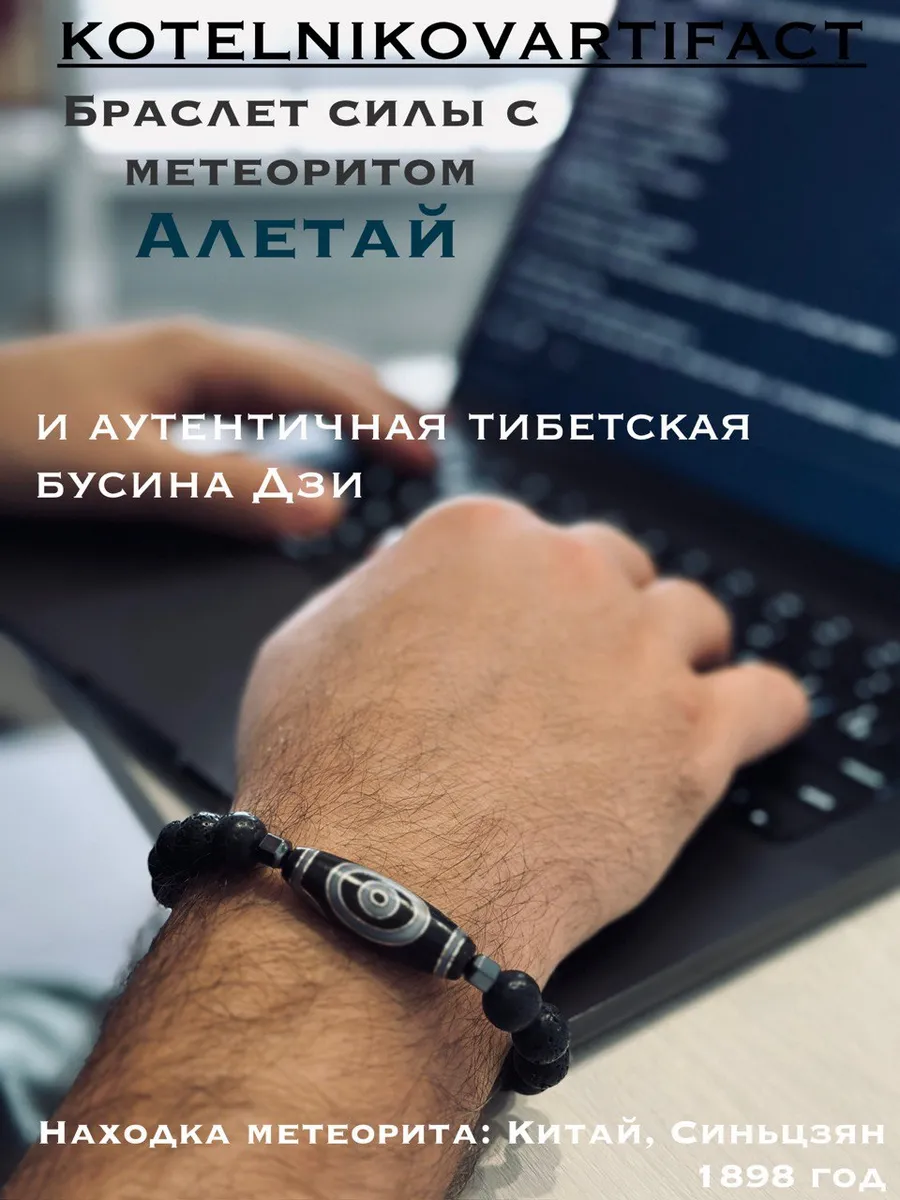 На противоположной стороне браслета — бусина из метеорита Алетай (10 мм). Этот железный метеорит упал на Землю в Китае и пролежал в земле тысячи лет. Космический металл возрастом 4,5 миллиарда лет усиливает волевые качества и связывает владельца с энергией Вселенной.