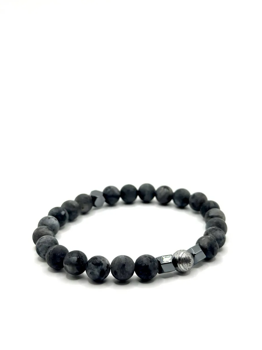 На вашем запястье — союз двух миров. Матовые бусины лабрадорита хранят свет северного сияния, а в центре — фрагмент метеорита Алетай, пролетевшего миллиарды километров сквозь космическое пространство.