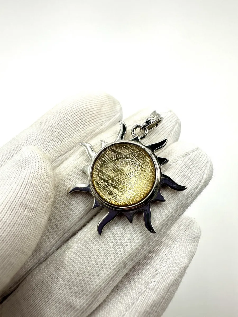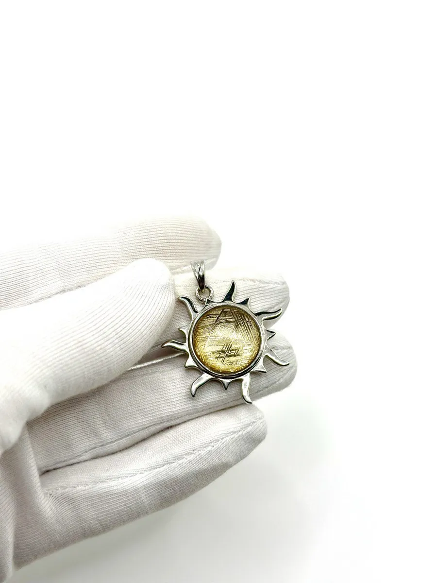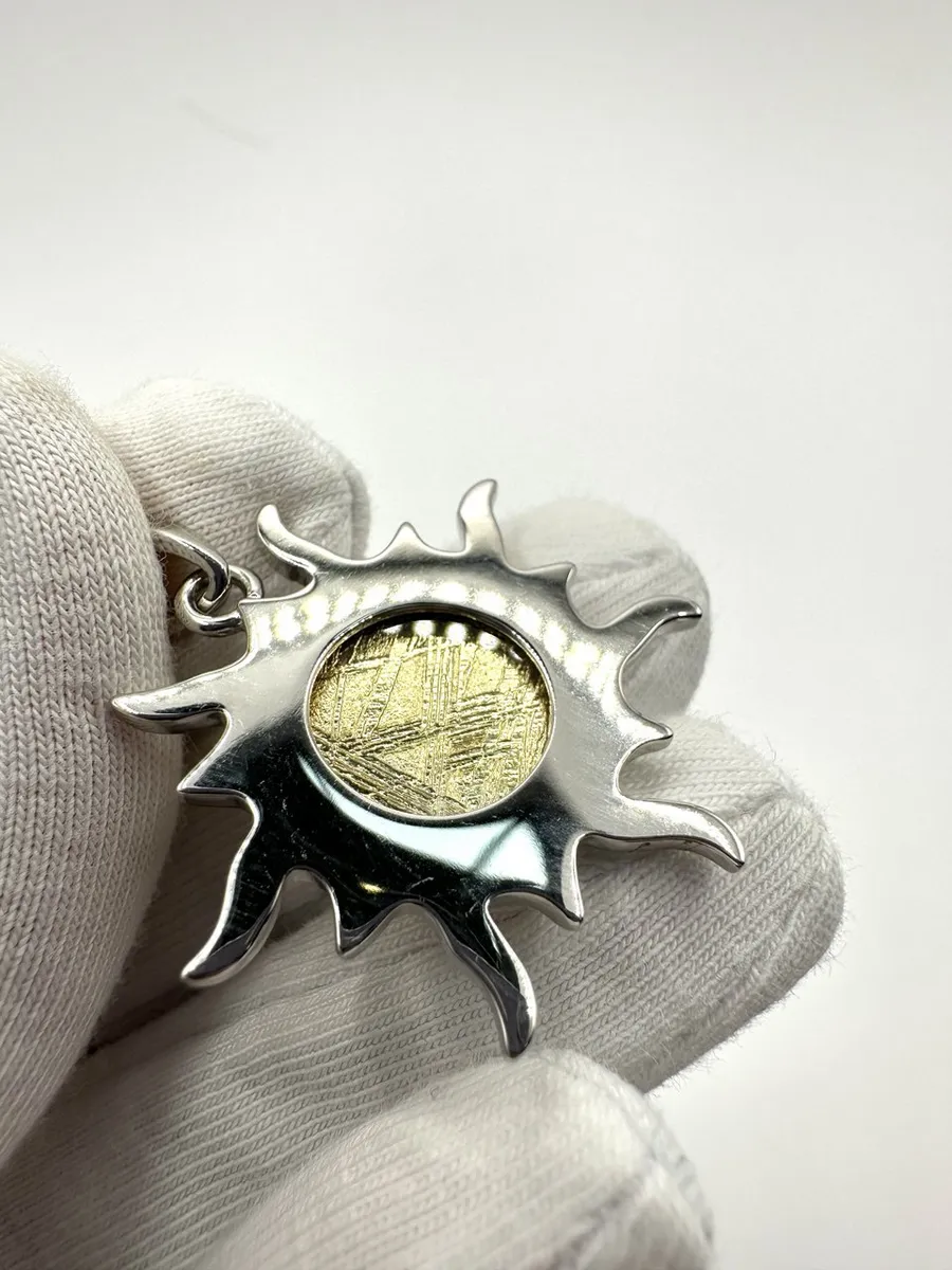 Это уникальное украшение, объединяющее энергию древнего космоса и силу солнечного символа - величественную подвеску с инкрустацией метеорита Муонионалуста, возраст которого составляет 4.5 миллиарда лет.