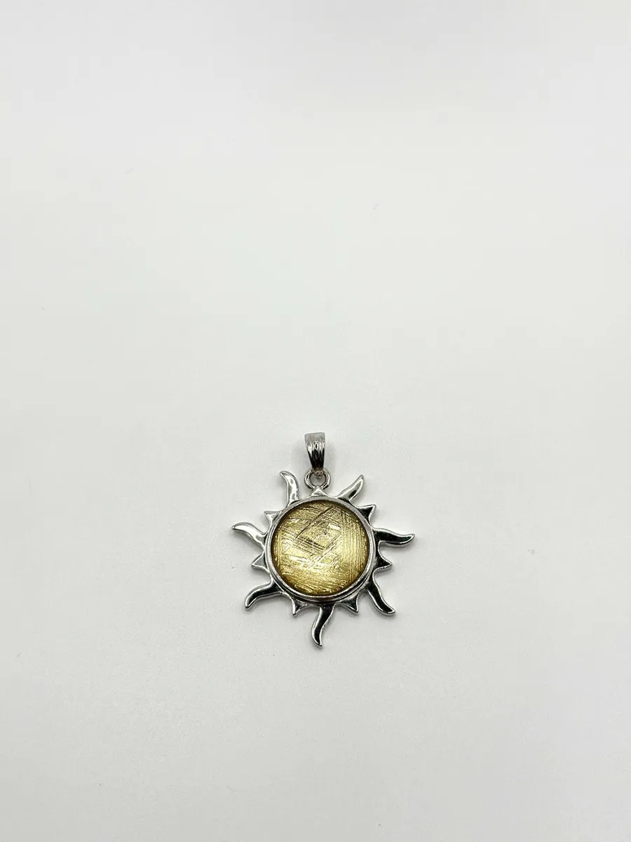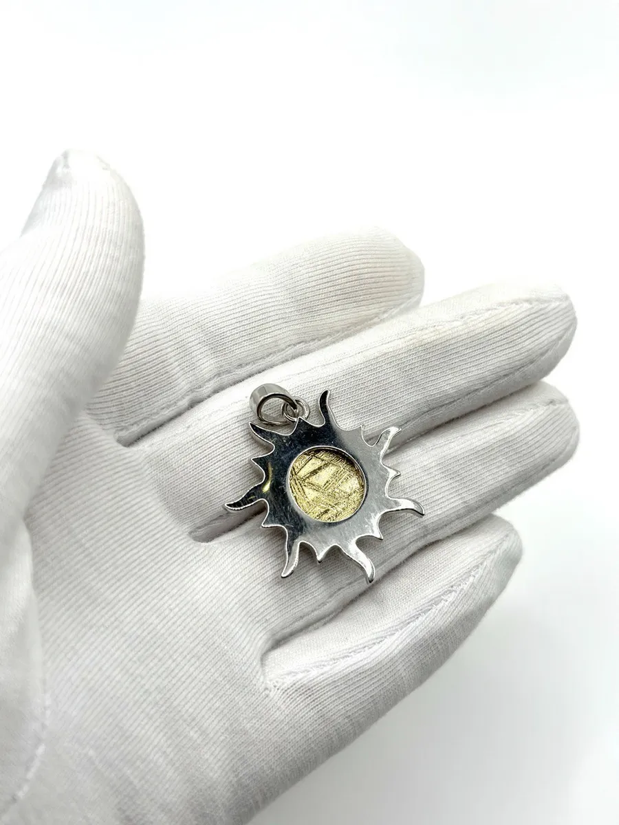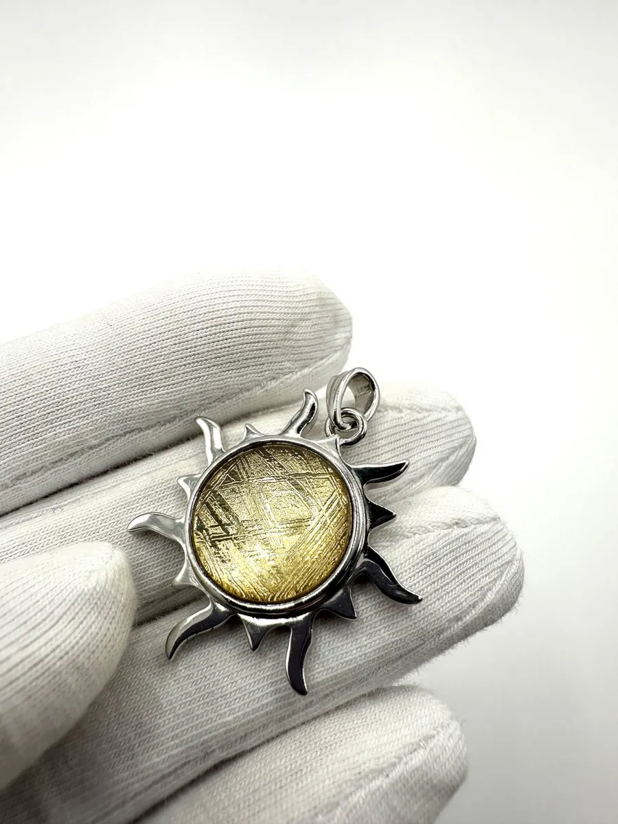 Это уникальное украшение, объединяющее энергию древнего космоса и силу солнечного символа - величественную подвеску с инкрустацией метеорита Муонионалуста, возраст которого составляет 4.5 миллиарда лет.